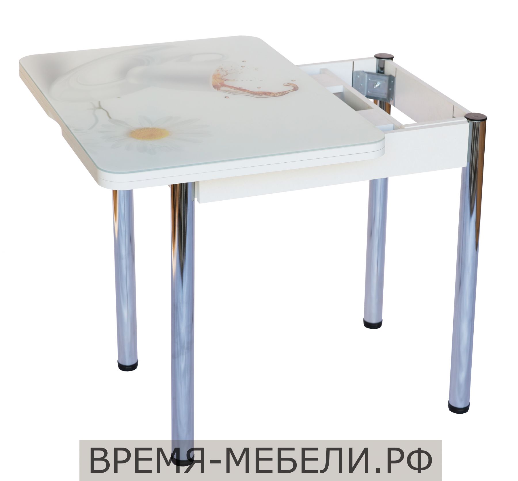 Стол со стеклянной поверхностью, поворотно-раскладной.